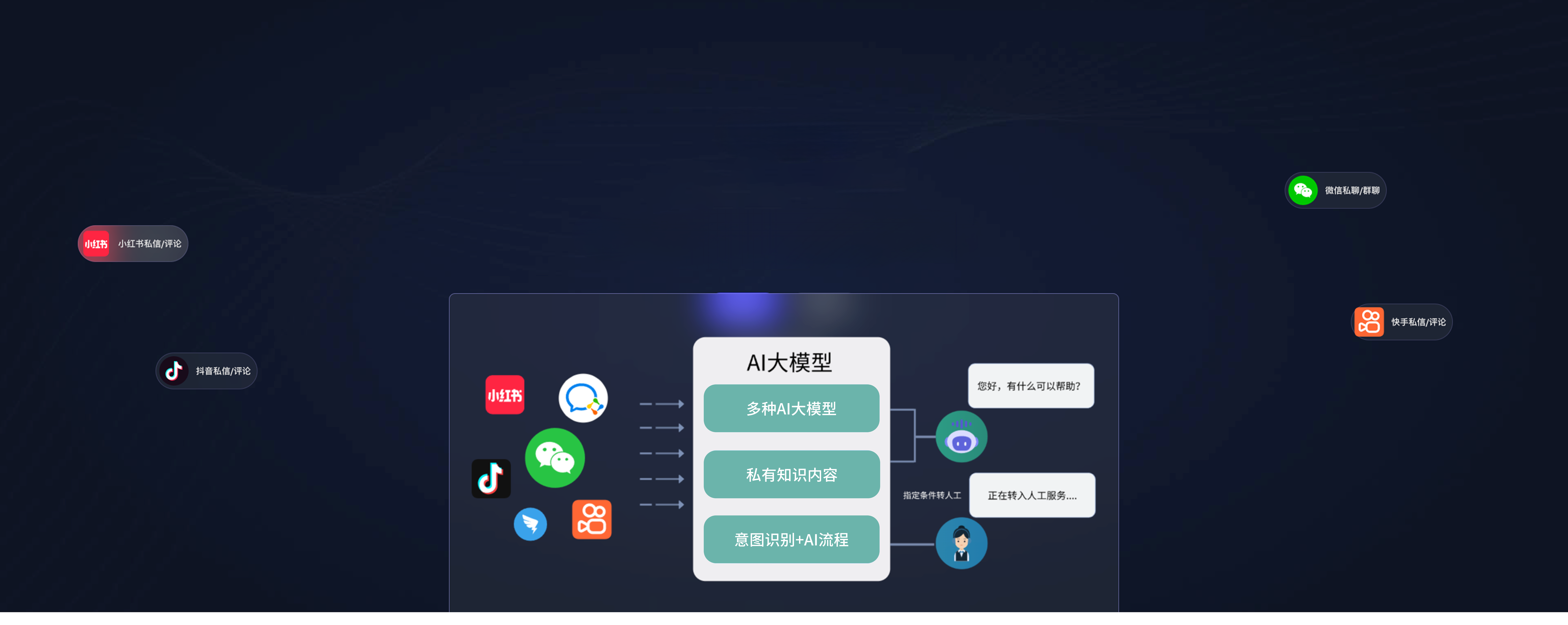 聚合对话是热点AI的特色功能,可以将多个对话渠道,目前支持:抖音(私信,评论,群聊),小红书(私信,评论),微信(私聊,群聊),快手(私信),公众号,微信客服(可在视频号,微信小商店使用),飞书,钉钉,企业微信中的对话聚合在一个平台进行AI统一回复,同时支持在指定条件下由AI转入人工服务,人工服务后在转入AI对话,实现AI与人工服务相互转换,更好的解决用户问题。